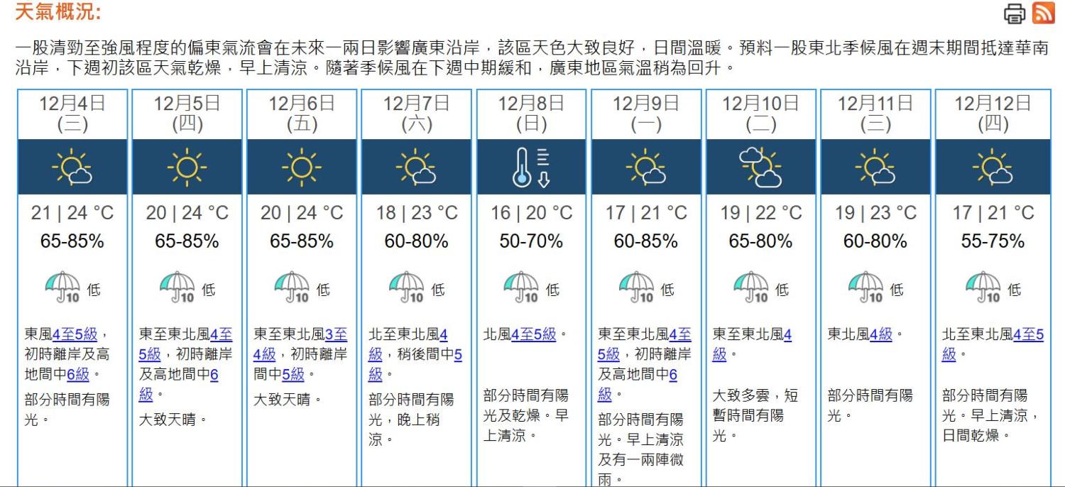 即時熱點 天氣|天文台:吹和緩至清勁東風 最高24°C (09:33) 發佈於 11 個月 前 2024 年 12 月 4 日 By 明報 上午9時20分,天文台錄得氣溫22°C,相對濕度68%。一股清勁至強風程度的偏東氣流正影響廣東沿岸,而覆蓋該區的雲帶稍為轉薄。 本港地區今日(4日)天氣預測部分時間有陽光,最高氣溫約24°C。吹和緩至清勁東風,初時離岸及高地間中吹強風。展望未來一兩日大致天晴,日間溫暖。周末期間漸轉吹偏北風,下周初早上清涼。(天文台) 相關文章:天文台天氣天氣速遞編輯推介 Up Next 短片:韓逾千人示威促尹錫悅下台 示威者:尹錫悅如小孩 不知自己做什麼 (11:45) 不要錯過 廣島沖繩擬向旅客徵住宿稅 料2026年生效 (18:11) 繼續閱讀 贊助商 猜你喜歡 天氣|天文台:周五有驟雨 氣溫28至32°C (19:45) 天氣|天文台:周四局部地區有驟雨 日間炎熱最高32°C (21:00) 天氣|天文台:今早多處地區錄5毫米雨量 今日多雲有驟雨 下午部分地區雨勢較大有雷暴 (09:20) 天氣|酷熱警告生效 天文台:周末有一兩陣驟雨 (08:22) 天氣|天文台:周四天晴局部地區有驟雨 最高32°C (20:56) 今年10月已有4日達33℃以上 破1884年以來紀錄 (17:45)