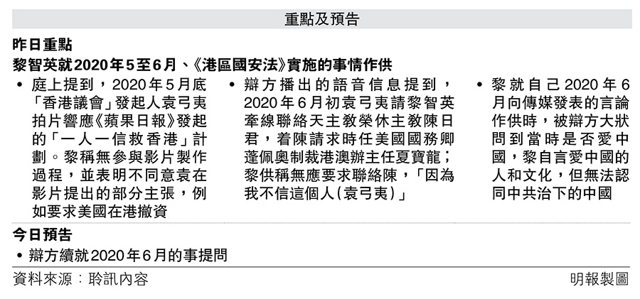 辯方大律師關文渭昨日開始問及2020年6月發生的事。黎智英就6月7日跟「徒弟」李兆富的WhatsApp信息作供時再次確認,自己當時主張制裁中國政府。關文渭問黎當時「愛中國嗎?」黎答:「這取決於你所指的中國是什麼。」關文渭追問,黎智英愛作為政府(as a state)的中國嗎?黎自言愛中國的人和文化,但無法認同中共治下的中國,因為自己的價值跟中共政權相左。至於現時心態,黎稱仍然愛中國,但不愛中國政府。