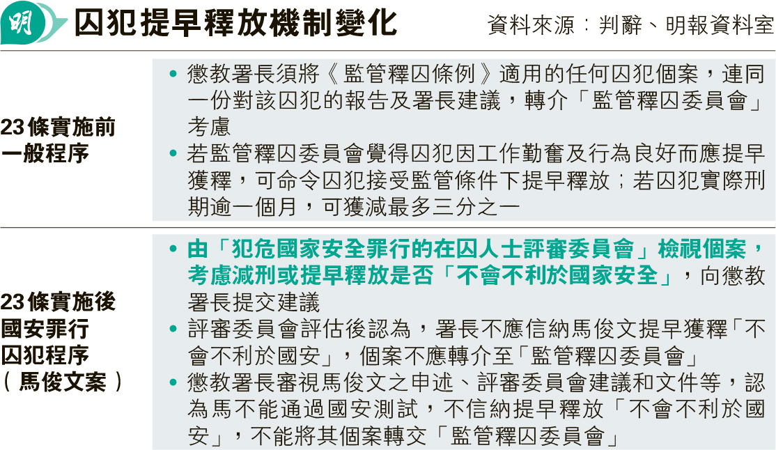 【明報專訊】根據判辭,馬俊文曾在書面申訴稱「現今之香港環境已無法反抗,唯有接受現實」。懲教署長批評馬基於實際情况妥協,無對危害國安展示真誠悔意,未能通過國安測試。判辭亦披露,23條生效後前兩日,審視國安被告可否減刑的「犯危國家安全罪行的在囚人士評審委員會」(下稱評審委員會)已成立。