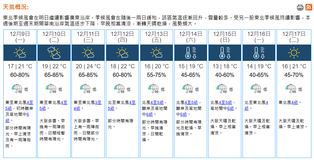 【17:35】乾燥東北季候風正影響廣東沿岸。同時,一道雲帶正覆蓋中國東南部。本港方面,下午大部分地區的相對濕度維持在60%左右。本港地區今晚(8日)及明日(9日)天氣預測:大致多雲,晚間有一兩陣微雨。明早清涼,市區最低氣溫約17°C,新界再低兩三度。日間部分時間有陽光,最高氣溫約21°C。吹和緩至清勁東至東北風,明日初時離岸及高地間中吹強風。展望隨後一兩日氣溫回升,雲量較多。周四轉吹偏北風,本周後期再度轉涼。九日天氣預報顯示,12月14日周六氣溫將降至15°C;12月15日下周日氣溫低至13°C。