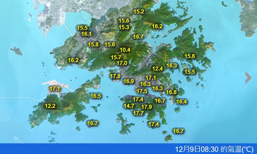 即時熱點 天氣|天文台:今早各區普遍降至16、17°C 未來一兩日氣溫回升 (08:39) 發佈於 10 個月 前 2024 年 12 月 9 日 By 明報 上午8時20分,天文台錄得17.5°C,相對濕度71%。東北季候風正為廣東沿岸帶來清涼的天氣,同時一道雲帶覆蓋該區。本港今早(9日)各區氣溫普遍降至16、17°C。 本港今日天氣預測大致多雲,早上清涼,下午部分時間有陽光,最高氣溫約21°C。吹和緩至清勁東至東北風。展望未來一兩日氣溫回升,雲量較多。周四(12日)轉吹偏北風,本周後期再度轉涼。(天文台) 相關文章:天文台天氣天氣速遞編輯推介 Up Next 泰女星曾按頸局部癱瘓亡 按摩5注意 扭頸啪腰應找專業人士 (11:48) 不要錯過 街馬半馬有跑手稱跑多了9公里 半馬賽變跑30公里 (15:50) 繼續閱讀 贊助商 猜你喜歡 天氣|天文台:周五有驟雨 氣溫28至32°C (19:45) 天氣|天文台:周四局部地區有驟雨 日間炎熱最高32°C (21:00) 天氣|天文台:今早多處地區錄5毫米雨量 今日多雲有驟雨 下午部分地區雨勢較大有雷暴 (09:20) 天氣|酷熱警告生效 天文台:周末有一兩陣驟雨 (08:22) 天氣|天文台:周四天晴局部地區有驟雨 最高32°C (20:56) 今年10月已有4日達33℃以上 破1884年以來紀錄 (17:45)