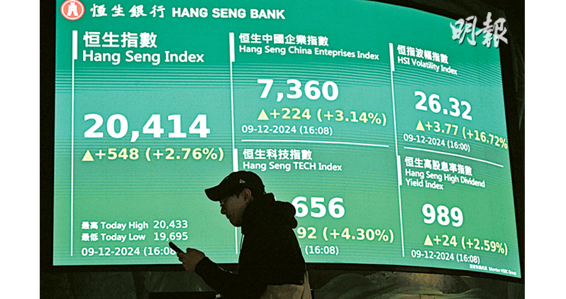 【明報專訊】中共中央政治局會議十多年後重提貨幣政策「適度寬鬆」,市場憧憬減息降準陸逐有來,恒指尾市在大成交配合下飈升逾560點,強勢重上兩萬點大關;成交再突破2000億元,恒指與大市成交同見近1個月最高。北水尾市亦見大舉淨流入,全日吸資近128億元,主力掃追蹤恒指的盈富基金(2800)。