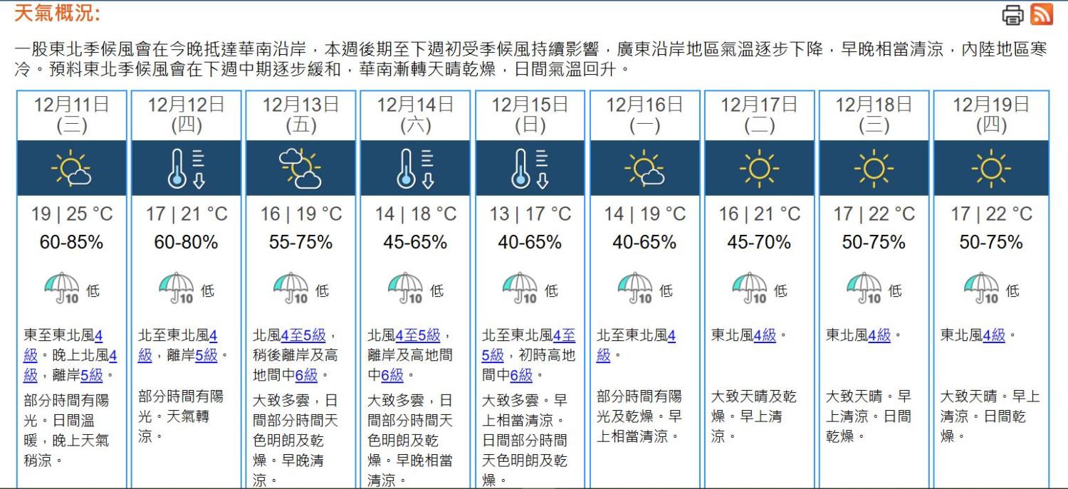即時熱點 天氣|天文台:本港日間最高25°C 晚上轉吹北風 (08:48) 發佈於 10 個月 前 2024 年 12 月 11 日 By 明報 上午8時30分,天文台錄得氣溫21.4°C,相對濕度74%。覆蓋華南沿岸的雲帶正逐漸轉薄。此外,廣東北部的氣壓正在上升,預料一股東北季候風會在今晚(11日)抵達沿岸地區。 本港地區今日天氣預測部分時間有陽光。日間溫暖,最高氣溫約25°C。吹和緩東至東北風,晚上轉吹北風,離岸風勢清勁,天氣稍涼。展望未來數日氣溫逐步下降,周末期間早晚相當清涼。(天文台) 相關文章:天文台天氣天氣速遞編輯推介 Up Next 「獺祭」酒廠擬太空釀酒 原因:人類倘移居月球仍要酒 (13:48) 不要錯過 泰女星曾按頸局部癱瘓亡 按摩5注意 扭頸啪腰應找專業人士 (11:48) 繼續閱讀 贊助商 猜你喜歡 天氣|天文台:周五有驟雨 氣溫28至32°C (19:45) 天氣|天文台:周四局部地區有驟雨 日間炎熱最高32°C (21:00) 天氣|天文台:今早多處地區錄5毫米雨量 今日多雲有驟雨 下午部分地區雨勢較大有雷暴 (09:20) 天氣|酷熱警告生效 天文台:周末有一兩陣驟雨 (08:22) 天氣|天文台:周四天晴局部地區有驟雨 最高32°C (20:56) 今年10月已有4日達33℃以上 破1884年以來紀錄 (17:45)