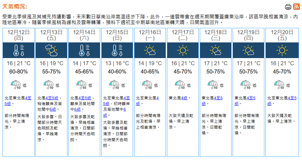 【20:30】一股東北季候風正逐漸影響廣東沿岸地區。本港地區今晚(11日)及明日(12日)天氣預測:漸轉多雲,晚間天氣轉涼,明早市區最低氣溫約16°C,新界再低兩三度,日間部分時間有陽光,最高氣溫約21°C。吹和緩北至東北風,風勢漸轉清勁。展望周五早晚清涼,周末期間風勢頗大,氣溫進一步下降,下周日市區最低氣溫13°C左右,新界再低兩三度。