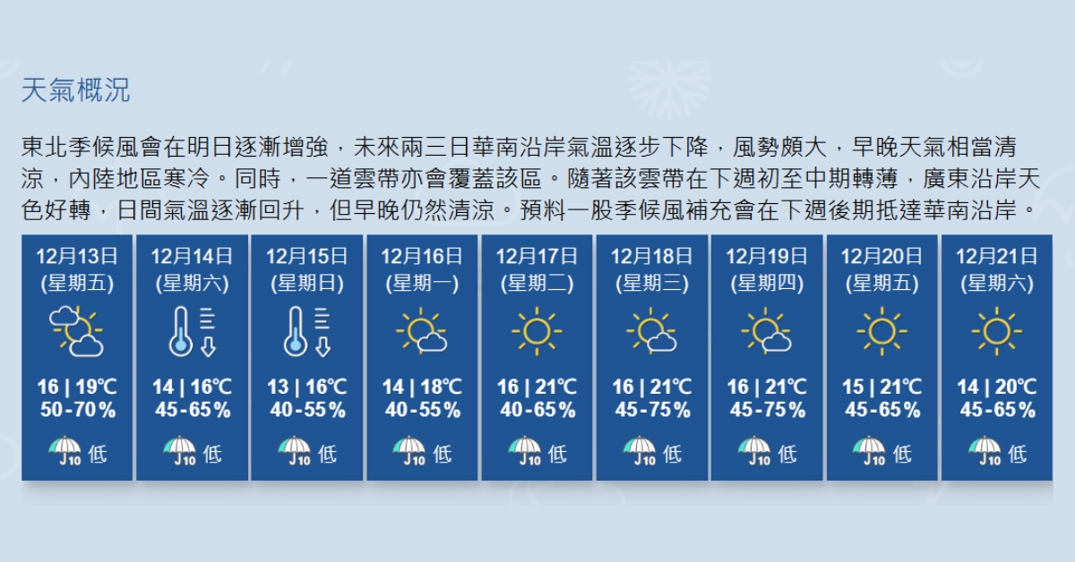 展望明日(13日)早晚清涼,周末期間風勢頗大,氣溫進一步下降,周日(15日)市區最低氣溫在13°C左右,新界再低兩三度。(天文台)