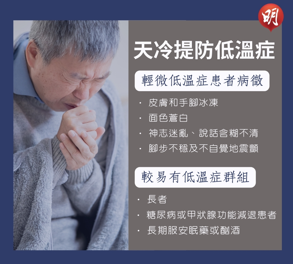 天文台預測,本港周日(15日)市區氣溫會跌至13℃,要特別留意長者會否出現低溫症的狀況。由於長者調節體溫的機能衰退及皮下脂肪減少,每當天氣轉冷,較容易因體溫下降而感到不適;若體溫大幅下降時,便有導致低溫症的危險。此外,患有慢性呼吸系統病如哮喘的長者,亦會較易因天氣轉冷而病情惡化。