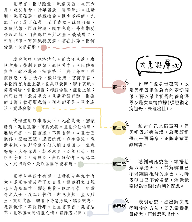 教育 建文博識:撼帝心之「孝」 發佈於 10 個月 前 2024 年 12 月 17 日 By 明報 【明報專訊】〈陳情表〉是蜀漢舊臣李密上奏晉武帝的文章,目的是婉拒朝廷的徵召。結果他不單達到目的,還成功打動武帝,既不罪其逆召,更賜奴婢二人以侍奉祖母。前人有云:讀李令伯(編按:李密字)〈陳情表〉而不墮淚者,其人必不孝。究竟〈陳情表〉有何力量,能移帝心,催人墮淚?且細看其表詳情及本文分析。 相關文章: Up Next 航天擬納初中科學 配合「科教興國」 框架設新單元「地球與太空」 下學年試行 不要錯過 指海外誤解多 演講常被問自由否 繼續閱讀 贊助商 猜你喜歡