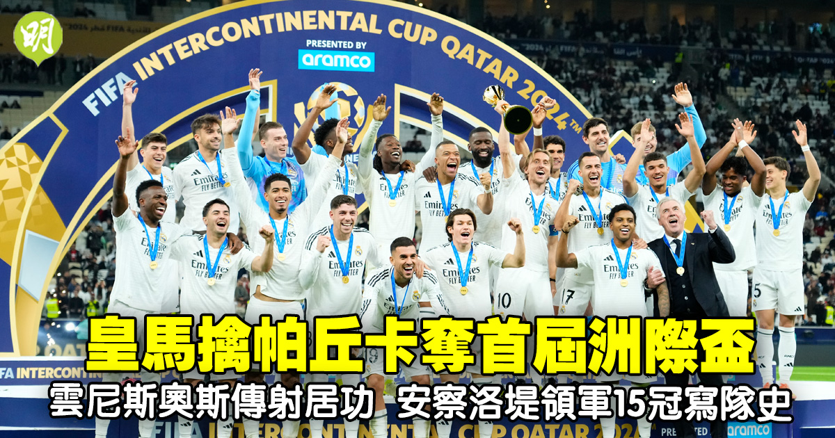應屆國際足協(FIFA)年度最佳男足球員獎項得主雲尼斯奧斯祖利亞,今晨(19日)在卡塔爾上演的首屆FIFA洲際盃決賽傳射居功,協助上季歐聯冠軍皇家馬德里,以3:0輕取上屆中北美洲及加勒比海冠軍盃盟主的墨西哥球會帕丘卡稱王,並令兩度執教皇馬的安察洛堤領軍累積第15座錦標成為隊史之最。