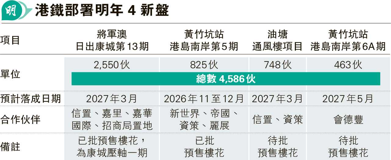 【明報專訊】港鐵新盤近年一直是香港新單位主要供應源,展望明年,估計將有4個全新港鐵樓盤登場,共涉4586個單位,兩個樓盤屬黃竹坑站港島南岸、一個為油塘通風樓項目、一個在將軍澳日出康城。