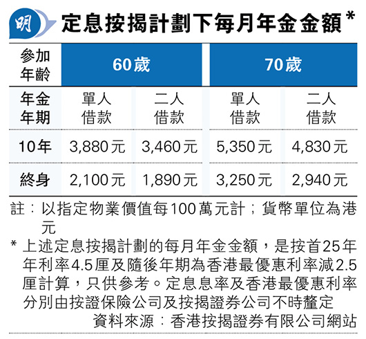 不過,世上沒有免費午餐,借款人不用還款,是由於當借款人過身,其後人可優先選擇是否償還貸款贖回物業,否則銀行將安排出售物業以償還貸款,若有任何餘額,銀行將退還給其後人。費用方面,承做逆按揭支出包括利息開支,會按安老按揭貸款的總結欠以複息計算。同時,申請人要支付按揭保費,將計入安老按揭貸款的總結欠,包括基本按揭保費,為指定物業價值的1.96%,以及每月按揭保費,根據安老按揭貸款的總結欠,以年率1.25%計算,按月支付。另有法律費用,即簽署按揭文件及其他相關法律文件而須繳付給律師的費用,還有的是輔導費,即繳付予輔導顧問作為提供輔導服務的費用。