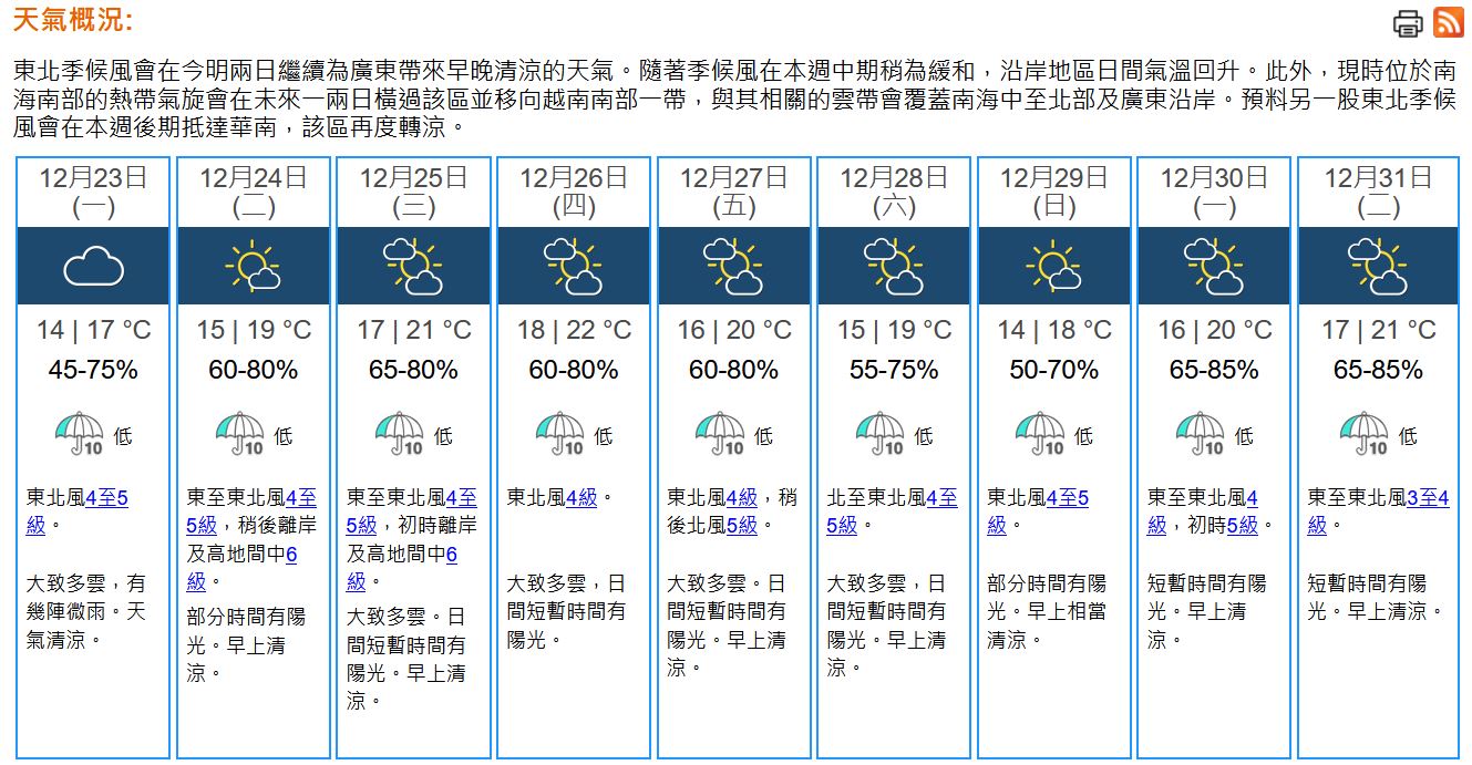 即時熱點 天氣|天文台:多雲有幾陣微雨 最高17°C (08:52) 發佈於 10 個月 前 2024 年 12 月 23 日 By 明報 上午8時40分,天文台錄得15.4°C,相對濕度54%。本港地區今日(23日)天氣預測大致多雲,有幾陣微雨。天氣清涼,最高氣溫約17°C。吹和緩至清勁東北風。 展望平安夜早上仍然清涼,晚上風勢較大。聖誕節假期短暫時間有陽光,日間和暖。本周後期再度轉涼。(天文台) 相關文章:天文台天氣天氣速遞編輯推介 Up Next 俄發現5萬年前長毛象BB屍 重100公斤長2米 (11:41) 不要錯過 天氣|天文台:天晴非常乾燥 吹北至東北風 (09:45) 繼續閱讀 贊助商 猜你喜歡 天氣|酷熱警告生效 天文台:周末有一兩陣驟雨 (08:22) 天氣|天文台:周四天晴局部地區有驟雨 最高32°C (20:56) 今年10月已有4日達33℃以上 破1884年以來紀錄 (17:45) 天氣|天文台:天晴酷熱最高33°C 局部地區有驟雨 (08:14) 天氣|天文台:周三天晴酷熱 最高33°C (21:00) 水利部和中國氣象局發布山洪預警 (22:56)