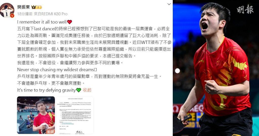不過樊振東重申「我還是我」,不會因此退役,會繼續努力參與不同比賽。他最後寫到,乒乓球是他童年少年青年歲月的榮耀勳章,自己不會遠離乒乓球,更不會離席體育。(樊振東微博)