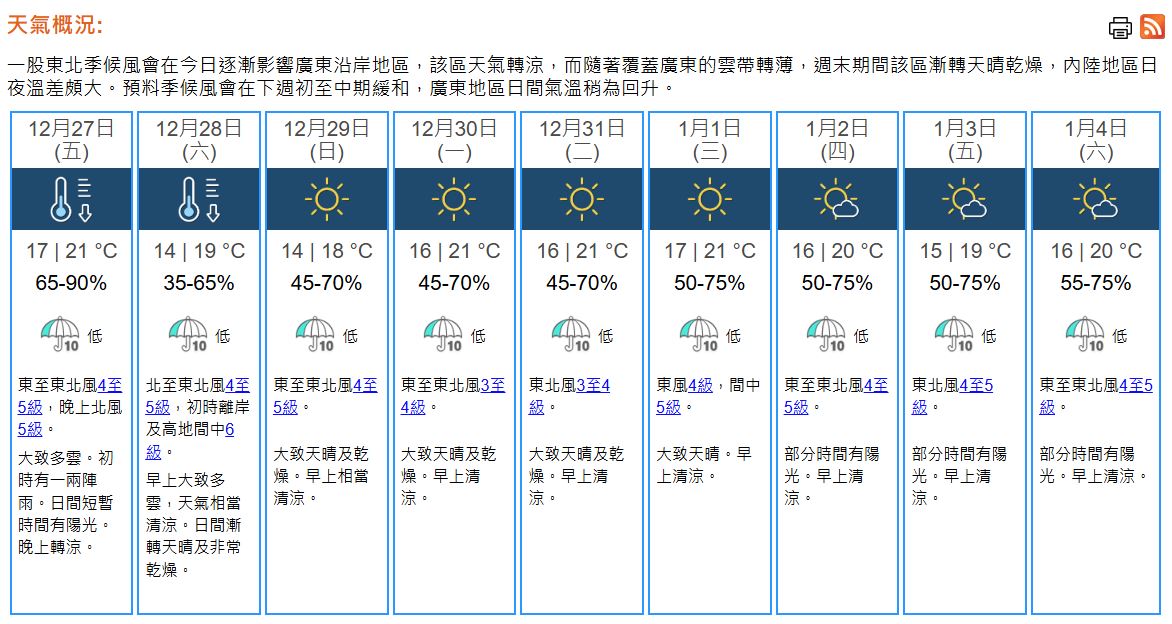 即時熱點 天氣|天文台:多雲有一兩陣雨 最高21°C (08:40) 發佈於 10 個月 前 2024 年 12 月 27 日 By 明報 早上8時30分,天文台錄得氣溫18.4°C,相對濕度80%。 一股東北季候風正逐漸影響廣東沿岸地區。同時,一道廣闊雲帶覆蓋廣東及南海北部。預料東北季候風會在今晚(27日)進一步增強,華南沿岸天氣轉涼。 本港地區今日大致多雲。初時有一兩陣雨,日間短暫時間有陽光,最高氣溫約21°C。吹和緩至清勁東至東北風,晚上轉吹清勁北風,天氣轉涼。展望周末期間大致天晴及乾燥,市區最低氣溫降至14°C左右,新界再低幾度。下周初至元旦早上仍然清涼,日間氣溫稍為回升。(天文台) 相關文章:天文台天氣天氣速遞編輯推介 Up Next 天氣|天文台:周日早上市區降至13℃ 新界寒冷再低幾度 (16:35) 不要錯過 倒數好去處|維港賞煙花、迪士尼倒數、沙田新城市廣場MIRROR成員勁歌熱舞迎2025年 (14:09) 繼續閱讀 贊助商 猜你喜歡 天氣|酷熱警告生效 天文台:周末有一兩陣驟雨 (08:22) 天氣|天文台:周四天晴局部地區有驟雨 最高32°C (20:56) 今年10月已有4日達33℃以上 破1884年以來紀錄 (17:45) 天氣|天文台:天晴酷熱最高33°C 局部地區有驟雨 (08:14) 天氣|天文台:周三天晴酷熱 最高33°C (21:00) 水利部和中國氣象局發布山洪預警 (22:56)