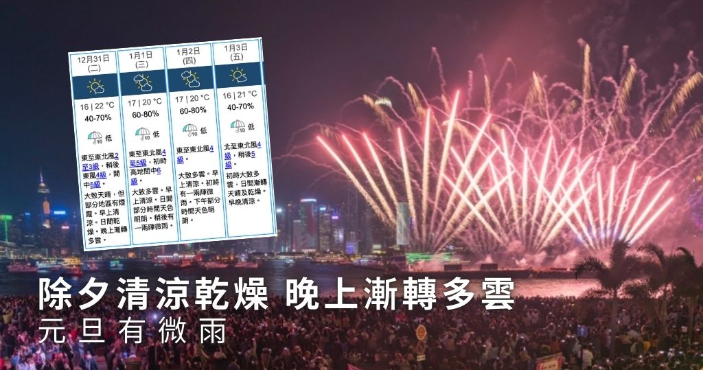 即時熱點 天文台:除夕清涼乾燥 晚上漸轉多雲 元旦有微雨 (17:19) 發佈於 9 個月 前 2024 年 12 月 30 日 By 明報 2024年即將完結,天文台預測,明天(12月31日)除夕氣溫介乎16至22°C,大致天晴,但部分地區有煙霞。早上清涼,日間乾燥。晚上維港將舉行煙花匯演,料漸轉多雲。至於明年1月1日元旦當天,天文台料大致多雲。早上清涼。日間部分時間天色明朗。稍後有一兩陣微雨,氣溫介乎17至20°C。 天文台又表示,受另一股乾燥的東北季候風影響,本周後期至下周初華南沿岸早晚清涼,日間天晴乾燥。(天文台) 相關文章:元旦天氣速遞編輯推介除夕 Up Next 麥當勞叔叔長櫈復刻 全港50地點打卡儲印章【附麥當勞叔叔長櫈50地點清單】 (21:11) 不要錯過 紫花風鈴木賞花情報|荔枝角公園、天水圍公園、屯門公園紫花風鈴木陸續開花【附開花實況短片】 (17:29) 繼續閱讀 贊助商 猜你喜歡 天氣|天文台:大致多雲 最高氣溫32°C (08:13) 中國北方局部明起降溫10℃以上 青藏有暴雪 (19:35) 麥德姆 | 廣東轉移逾15萬人 7市啟動應急響應 (00:59) 三號波|天文台:本港風力開始減弱 當普遍地區不再受強風威脅 會考慮改發一號戒備信號 (13:50) 中秋節天氣預告:驟雨減少 部分時間有陽光 (20:01) 所有熱帶氣旋警告信號取消 (22:25)