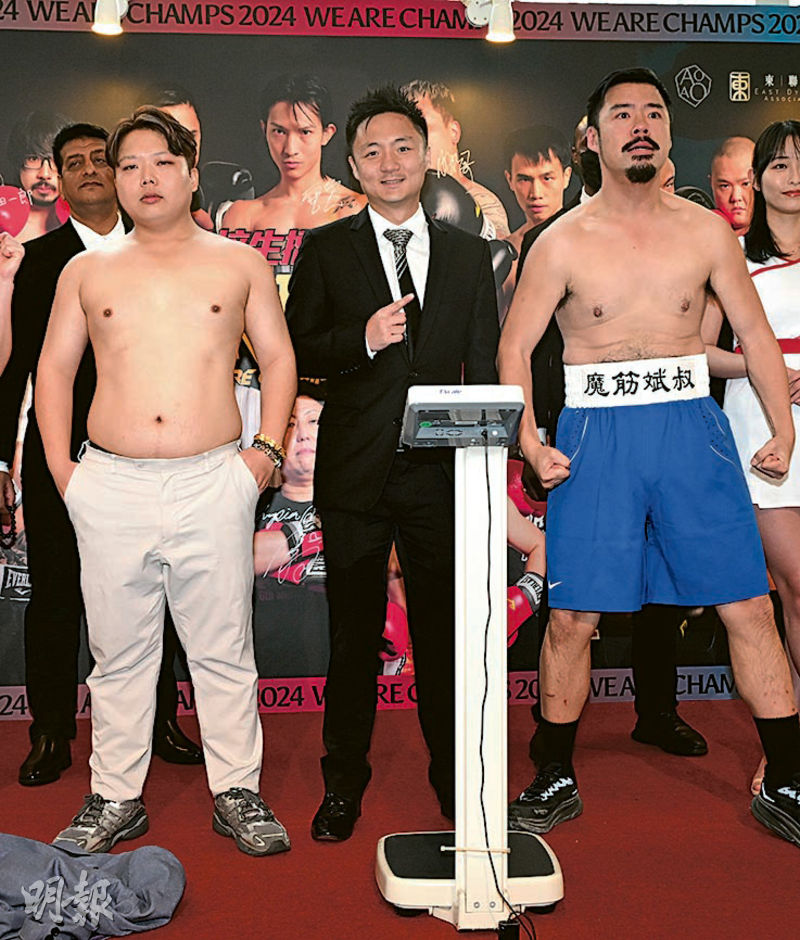 【明報專訊】「富三代」鍾培生今晚舉辦《培生擂台:無敵盃》,34名拳手昨日在記者會舉行過磅儀式。較受關注的賽事,有早前在無綫節目《呃錢》自爆墮婚姻介紹公司騙局的黃先生(BabyFace)首次參與打拳,跟去屆決賽勝出者「魔筋斌叔」對戰一回合,時間90秒。還有蔣介石後人蔣友青,以「北伐司令」之名迎戰本地薑「熙仔」。鋼條身形重約60公斤的蔣友青表示,賽前有少許壓力,但會全力以赴。「魔筋斌叔」希望台上使出「還原靚靚拳」,令BabyFace重拾雄風變「ManFace」。BabyFace說:「我為香港而戰,希望用勇氣感動大家!」他脫去上衣露出「士啤呔」,又大曬日語,呼籲台上的日籍拳賽女郎為他打氣,遭司儀嘲諷他比賽不忘撩女仔。