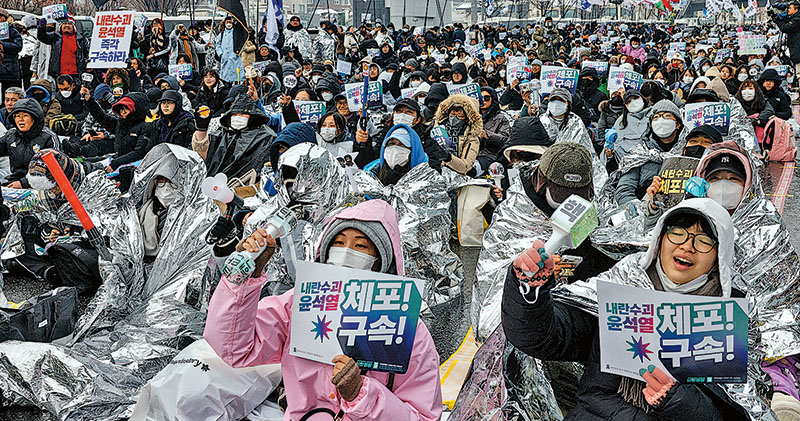 【明報專訊】韓國高級公職人員犯罪調查處(公調處)獲法院批出對總統尹錫悅涉嫌內亂罪的逮捕令,將於香港時間今天(6日)晚上11時屆滿,惟因去年12月3日戒嚴令風波而起的爭議不休,「撐尹」及「倒尹」的陣營昨天冒雪展開新一波抗議活動。尹錫悅代表律師以違憲為由要求禁制公調處的逮捕令和搜查令,到昨天據報被首爾西區地方法院駁回;律師稱考慮上訴至最高法院。然而,在總統警衛處阻撓下,公調處人員昨天放棄進入總統官邸執行逮捕令,未知今天會否再度嘗試,還是之後再向法院尋求進一步的申請。