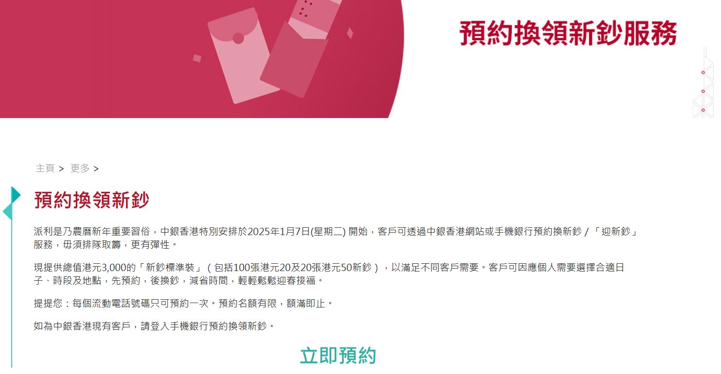 中銀香港的客戶可透過中銀香港網站或手機銀行預約換新鈔/「迎新鈔」服務,毋須排隊取籌。中銀香港稱,提供總值3000元的「新鈔標準裝」(包括100張20元及20張50元新鈔)。留意每個流動電話號碼只可預約一次。預約名額有限,額滿即止。[預約連結按此]