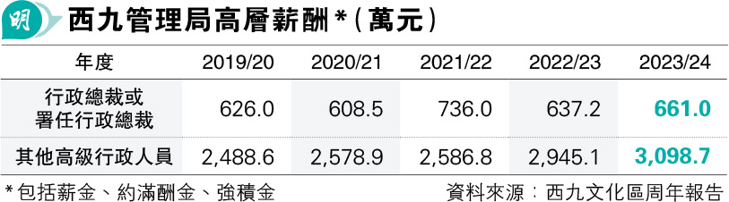 翻查西九管理局近5年嘅年報,行政總裁嘅酬金等開支比較浮動,但整體呈上升,由2020/21年度約626萬元,升到2023/24年度約661萬元,其他高級行政人員嘅酬金等開支則由2020/21年度約2488.6萬元,升到2023/24年度嘅3098.7萬元(見表)。