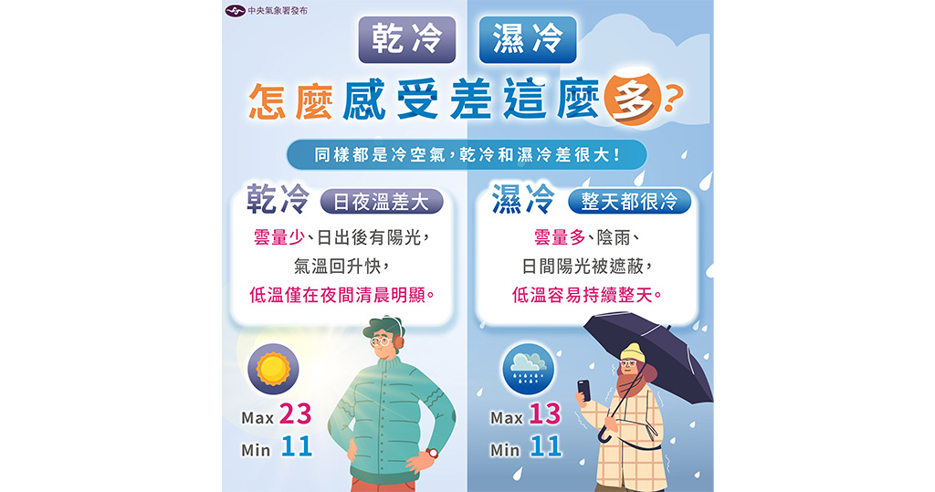 台灣中央氣象署在facebook發文,指出「濕凍」全日雲量偏多,較少陽光,白天溫度不易回升,因此日夜溫差小,低溫往往持續一整天。