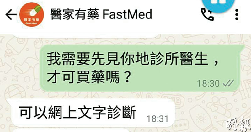【明報專訊】本報發現自稱全港最大網上醫生配藥平台「醫家有藥(FastMed)」可售賣處方藥物,聲稱可提供線上文字診斷並免診金。記者以顧客身分查詢訂購安眠藥和抗生素兩款處方藥,平台收款後安排「辛啟安醫生」提供「文字診斷」,問曾否用過有關藥物和用藥原因,便連同醫生紙將藥物寄出。有病人組織質疑診斷「求其」,形同濫發藥物,處方醫生有可能涉專業失德;議員質疑平台做法危及病人。醫家有藥回覆本報稱,有關個案診斷及藥物處方不會對患者健康構成任何危險,相關處理「完全在安全範圍內進行」,強調平台及診所秉承合法合規原則運營。