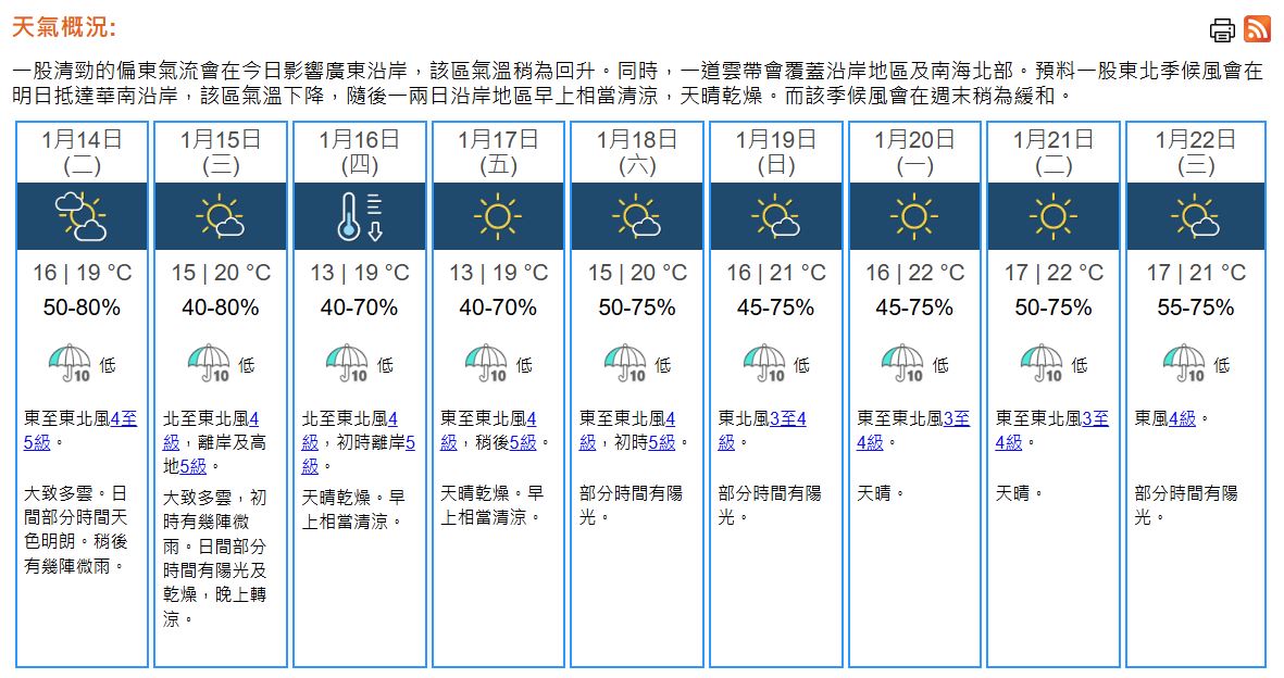 即時熱點 天氣|天文台:日間天色明朗最高19°C 明晚轉吹偏北風轉涼 (08:42) 發佈於 9 個月 前 2025 年 1 月 14 日 By 明報 早上8時30分,天文台錄得氣溫17°C,相對濕度52%。 一股清勁的偏東氣流正影響廣東沿岸。同時,一道雲帶正覆蓋該區及南海北部。本港方面,今早(14日)市區氣溫普遍較昨日(13日)高兩三度左右。 本港地區今日大致多雲。日間部分時間天色明朗,最高氣溫約19°C。稍後有幾陣微雨。吹和緩至清勁東至東北風。展望明日(15日)轉吹偏北風,晚上轉涼。隨後一兩日天晴乾燥,市區最低氣溫在13°C左右,新界再低幾度。(天文台) 相關文章:天文台天氣天氣速遞 Up Next 電動輪椅|消委會提醒電動輪椅非人人適合 部分慢性病患者或不宜使用 (15:02) 不要錯過 短片:洛杉磯山火現火龍捲 (13:35) 繼續閱讀 贊助商 猜你喜歡 天氣|天文台:今早多處地區錄5毫米雨量 今日多雲有驟雨 下午部分地區雨勢較大有雷暴 (09:20) 天氣|酷熱警告生效 天文台:周末有一兩陣驟雨 (08:22) 天氣|天文台:周四天晴局部地區有驟雨 最高32°C (20:56) 今年10月已有4日達33℃以上 破1884年以來紀錄 (17:45) 天氣|天文台:天晴酷熱最高33°C 局部地區有驟雨 (08:14) 天氣|天文台:周三天晴酷熱 最高33°C (21:00)