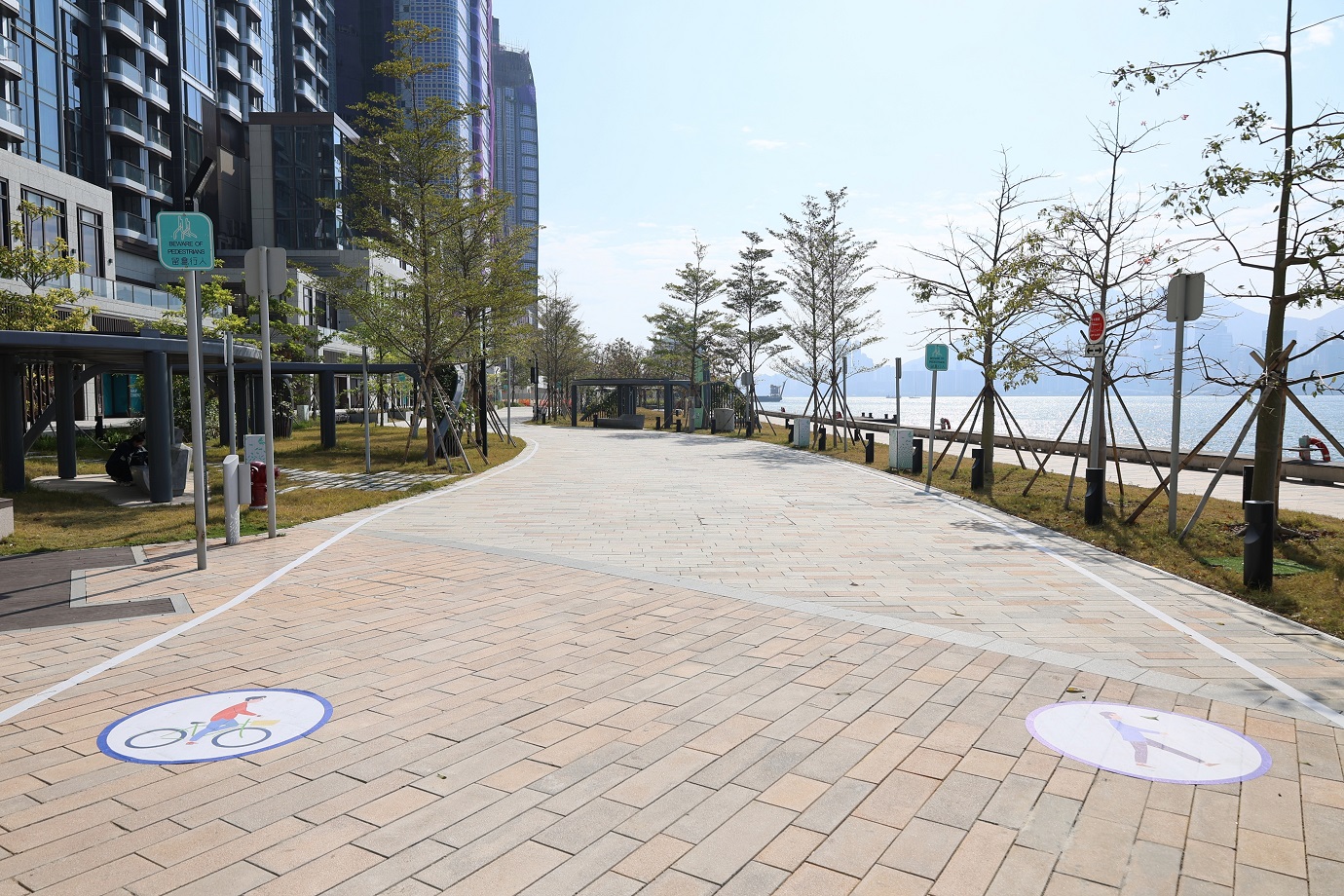 新開放的段落毗鄰維港,由康文署管理。通道闊約6米,有足夠空間供行人及單車共享;路面上亦設有標示,提示行人及騎單車人士靠向指示的一邊通道,以保持適當距離及提升使用安全。為免車速過快,通道部分位置設有指示牌及鋪設減速地磚。