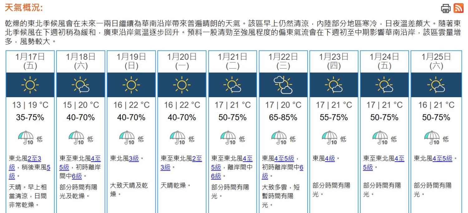 即時熱點 天氣|天文台:天晴乾燥最高19°C 周末及下周初仍然清涼 (08:17) 發佈於 9 個月 前 2025 年 1 月 17 日 By 明報 上午8時,天文台錄得氣溫13.2°C,相對濕度43%。 乾燥的東北季候風正為廣東帶來普遍晴朗的天氣。本港方面,今早(17日)市區氣溫下降至13°C或以下。由於天朗氣清,新界地區輻射冷卻尤其明顯,氣溫曾降至10°C或以下。 本港地區今日天晴。早上市區相當清涼,新界寒冷。日間非常乾燥,最高氣溫約19°C。吹輕微至和緩東北風,稍後轉吹清勁東風。展望周末及下周初早上仍然清涼,大致天晴及乾燥,日夜溫差較大。下周中期雲量增多,風勢較大。(天文台) 相關文章:天文台天氣天氣速遞編輯推介 Up Next 天氣|天文台:天晴乾燥 下周初早上清涼 (10:11) 不要錯過 天氣|天文台:周五最低13°C 日間非常乾燥 (21:08) 繼續閱讀 贊助商 猜你喜歡 天氣|酷熱警告生效 天文台:周末有一兩陣驟雨 (08:22) 天氣|天文台:周四天晴局部地區有驟雨 最高32°C (20:56) 今年10月已有4日達33℃以上 破1884年以來紀錄 (17:45) 天氣|天文台:天晴酷熱最高33°C 局部地區有驟雨 (08:14) 天氣|天文台:周三天晴酷熱 最高33°C (21:00) 水利部和中國氣象局發布山洪預警 (22:56)