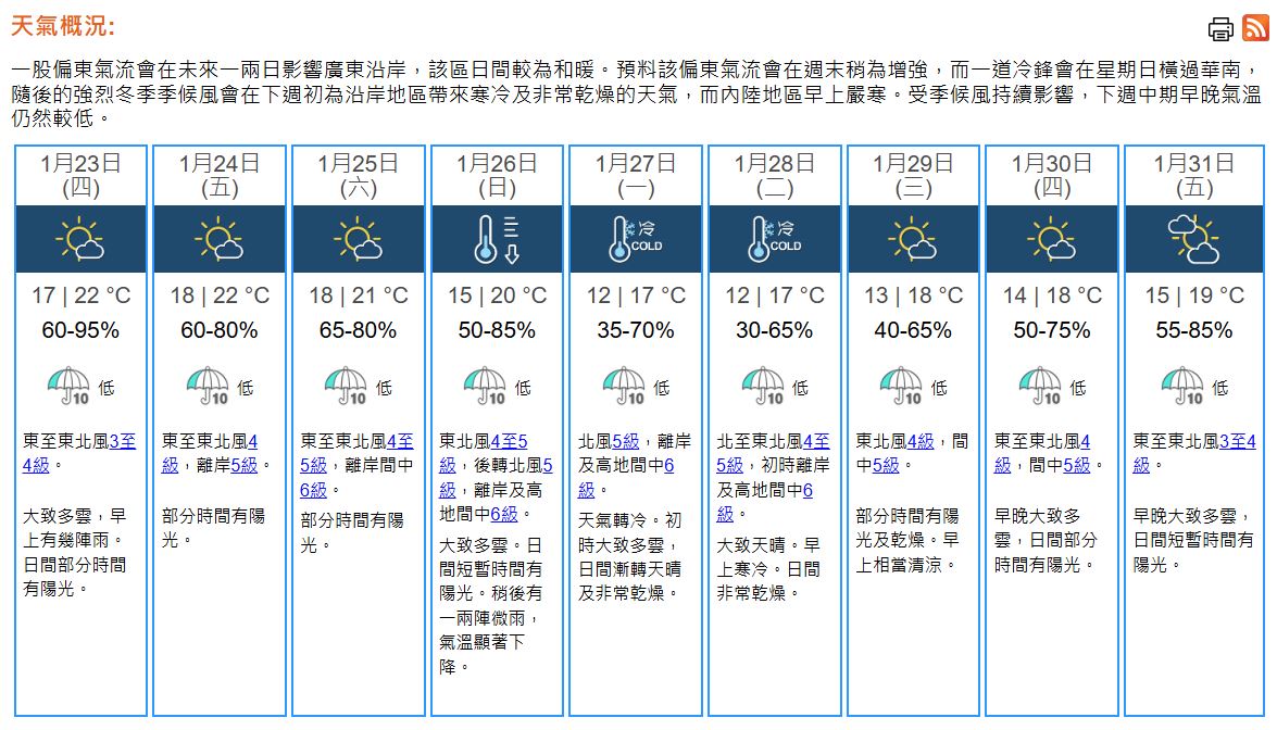 即時熱點 天氣|天文台:早上有雨 日間有陽光 最高22°C (08:47) 發佈於 9 個月 前 2025 年 1 月 23 日 By 明報 早上8時30分,天文台錄得氣溫18.3°C,相對濕度89%。一股偏東氣流正影響廣東沿岸。同時,一道雲帶覆蓋該區。本港方面,今早(23日)大部分地區錄得約5毫米雨量。 本港地區今日大致多雲。早上有幾陣雨。日間部分時間有陽光,最高氣溫約22°C。吹和緩東至東北風。 展望未來一兩日日間和暖。下周日(26日)至周一(27日)北風逐漸增強,下周一及年廿九(28日)天氣寒冷。年初一(29日)及年初二(30日)早晚氣溫仍然較低。(天文台) 相關文章:天文台天氣天氣速遞 Up Next 藍罐曲奇:留意到市場現仿冒品 話你知真藍罐曲奇特點 (14:50) 不要錯過 天氣|天文台:年廿八年廿九天氣轉冷非常乾燥 農曆年假早晚氣溫較低 (17:40) 繼續閱讀 贊助商 猜你喜歡 天氣|天文台:今早多處地區錄5毫米雨量 今日多雲有驟雨 下午部分地區雨勢較大有雷暴 (09:20) 天氣|酷熱警告生效 天文台:周末有一兩陣驟雨 (08:22) 天氣|天文台:周四天晴局部地區有驟雨 最高32°C (20:56) 今年10月已有4日達33℃以上 破1884年以來紀錄 (17:45) 天氣|天文台:天晴酷熱最高33°C 局部地區有驟雨 (08:14) 天氣|天文台:周三天晴酷熱 最高33°C (21:00)