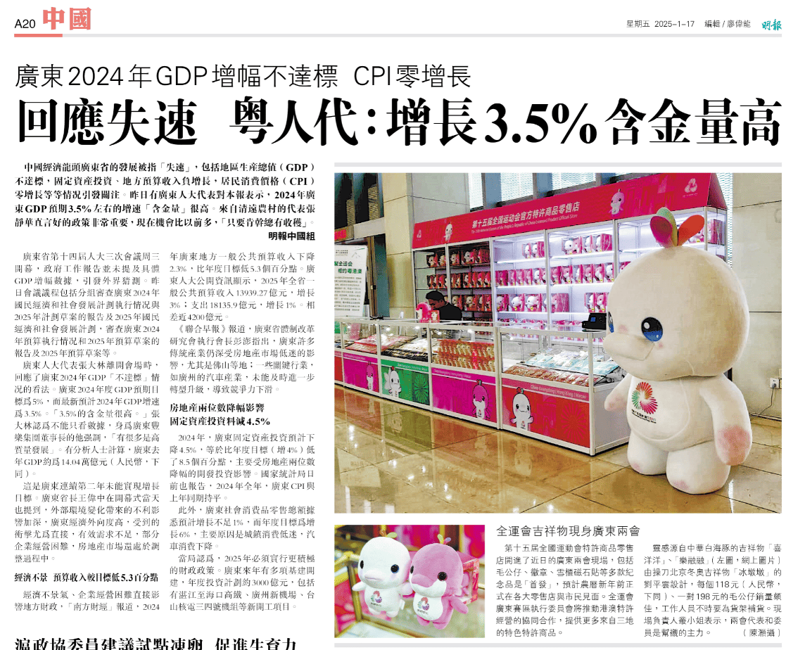 根據地區生產總值(GDP)統一核算結果,2024年,全省地區生產總值141633.81億元(人民幣,下同),按不變價格計算,比上年增長3.5%。這一增長幅度,證實了《明報》1月17日的獨家報道(《回應失速 粵人代:增長3.5%含金量高》)。