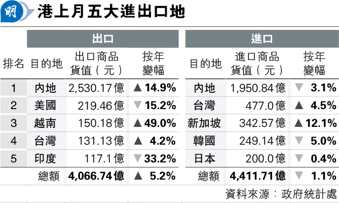 政府發言人表示,上月輸往內地的出口明顯擴張,輸往歐盟的出口轉升;出口至美國則進一步下跌。展望未來,外圍不確定因素尤其是貿易摩擦,或壓抑香港的出口表現,不過內地政府推出多項提振當地經濟措施,應能提供支持。