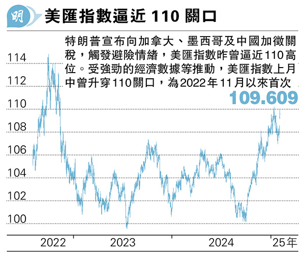 在墨西哥和加拿大擁有大量生產業務的汽車股一度大幅下挫,通用汽車(美:GM)、佳士拿母企Stellantis(美:STLA)早段股價跌逾4%,至暫緩向墨西哥徵稅消息傳出後,跌幅大為收窄。資金昨購買美元避險,美元一枝獨秀。美匯指數昨逼近110,接近3周高位,其後回落至108.8。午夜前公布的美國1月ISM製造業指數升至50.9,出乎意料恢復至50以上的擴張水平,是製造業活動連續26個月處於收縮後首次擴張。