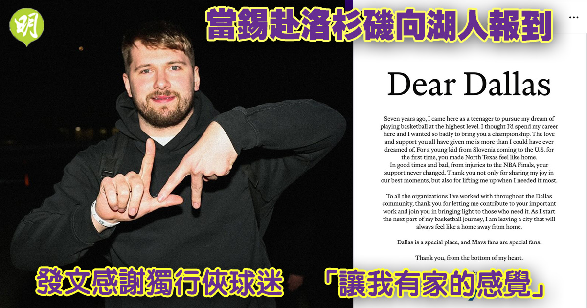 上屆NBA總亞軍的獨行俠,昨傳出將頭號球星當錫交易至湖人後,不少球迷更自製棺材到球隊主場的美國航空中心外向他告別。直至今日,兩隊終落實有關消息並分別發文歡迎新球員,而屬主角之一的當錫隨即到達洛杉磯向新東家報到,他亦在社交網撰文向達拉斯當地球迷道:「7年前,十來歲的我來到這裏追尋在最高水準上打籃球的夢想。我以為我會在這裏度過我的職業生涯,我非常想為你們帶來一座冠軍獎盃。你們給我的愛與支持遠遠超越了我的夢想。對於一個首次來到美國的斯洛文尼亞小孩來說,你們讓我有一個家的感覺。」另方面,他又向湖人球迷稱感謝這次加盟機會,「籃球對我來說意味着一切,無論我在哪裡打球,我都會懷着同樣的快樂、熱情和目標去打球並贏得冠軍」。而湖人的40歲「大帝」勒邦占士據報知悉交易後,也會願意留效組成「雙核」,不會選擇離隊。