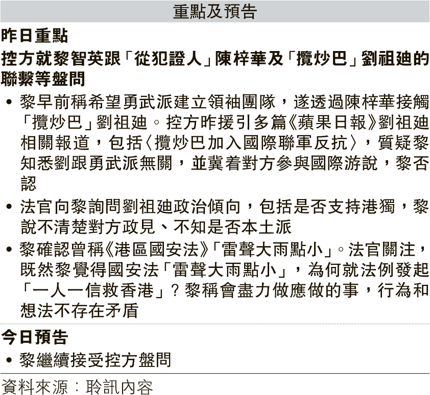 【明報專訊】壹傳媒黎智英及《蘋果日報》公司涉串謀勾結外國勢力案昨踏入第129日審訊,黎重申冀勇武派「精神領袖」劉祖廸在該派組建「領袖團隊」,規範他們行動,遂接觸對方。控方援引多篇《蘋果》劉祖廸相關報道,包括〈攬炒巴加入國際聯軍反抗〉,質疑黎知悉劉跟勇武派無關,並冀着對方從事國際游說;黎一概否認。另外,法官問到劉祖廸是否主張「港獨」?黎說不知道對方政見。