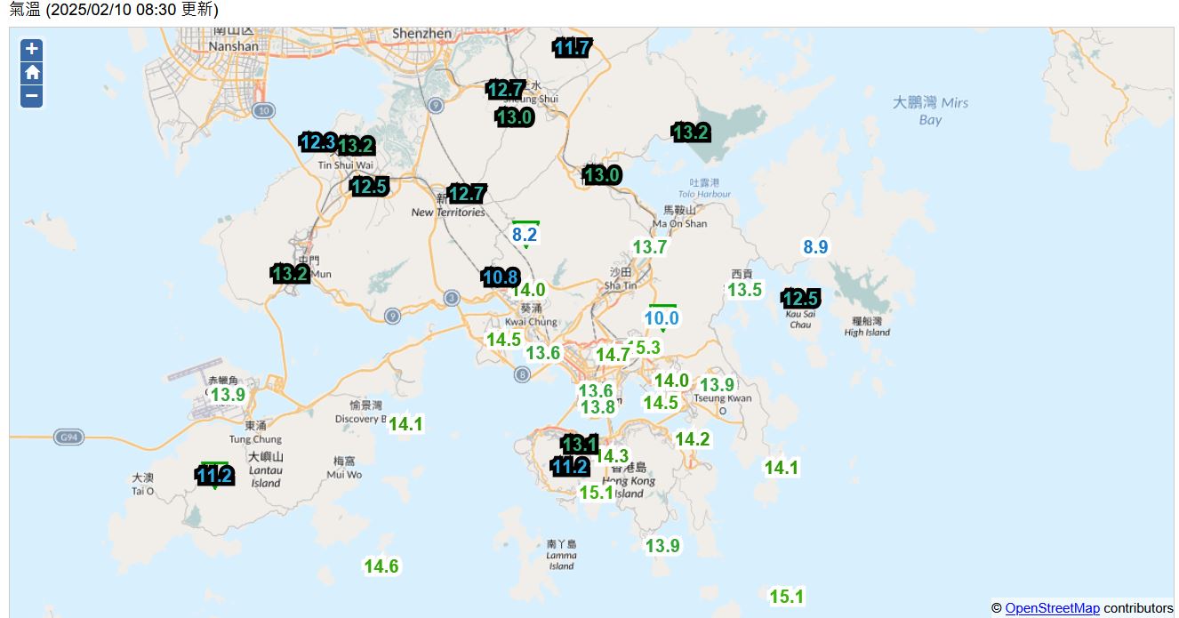 即時熱點 天氣|天文台:今早市區降至12°C 新界再低兩三度 (08:44) 發佈於 8 個月 前 2025 年 2 月 10 日 By 明報 上午8時半,天文台錄得13.8°C,相對濕度59%。東北季候風正為廣東沿岸帶來寒冷及普遍晴朗的天氣,本港今早市區氣溫下降至12°C左右,新界再低兩三度。 本港地區今日天氣預測大致天晴及乾燥,日間最高氣溫約18°C,晚上雲量逐漸增多。吹和緩至清勁偏東風,初時離岸及高地間中吹強風。 展望明日(11日)氣溫回升,漸轉多雲,周三(12日)較為潮濕及有一兩陣雨。隨後一兩日風勢較大。(天文台) 相關文章:天文台天氣天氣速遞編輯推介 Up Next 短片:英國百架拖拉機堵路 農民抗議繼承農場繳遺產稅 (12:03) 不要錯過 吊鐘花2025|紅花嶺吊鐘花喜迎春 (17:52) 繼續閱讀 贊助商 猜你喜歡 天氣|天文台:周五有驟雨 氣溫28至32°C (19:45) 天氣|天文台:周四局部地區有驟雨 日間炎熱最高32°C (21:00) 天氣|天文台:今早多處地區錄5毫米雨量 今日多雲有驟雨 下午部分地區雨勢較大有雷暴 (09:20) 天氣|酷熱警告生效 天文台:周末有一兩陣驟雨 (08:22) 天氣|天文台:周四天晴局部地區有驟雨 最高32°C (20:56) 今年10月已有4日達33℃以上 破1884年以來紀錄 (17:45)