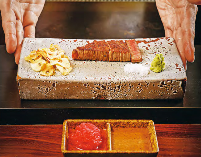 【明報專訊】情人節當然要食餐好。位於香港四季酒店的全新高級日本餐廳「鉄板焼.天ぷら 旬」剛推出全新的鐵板燒天麩羅廚師發辦(每位$2680),晚餐11道菜包括前菜、刺身、鐵板燒及天麩羅菜式等。材料按每日時令採購,大部分從日本直送香港。主理鐵板燒的是入廚逾30年的鐵板燒主廚神子仲康,他的功力紮實,招牌菜鐵板燒和牛,嚴選日本宮崎縣的A5級和牛牛柳心,油花細膩,肉質柔軟。高溫煎香牛柳心至五成熟,保留香滑的肉汁。客人可佐以脆蒜片、黑椒肉汁或醋醃蘿蔔蓉提味。除了肉類,廚師還會即場將原隻重約300克的日本活伊勢龍蝦在鐵板上烹調,先取蝦膏炒香,再加入龍蝦肉一同炒,增添鹹香,與特製的鐵板燒舞茸同吃,別有一番滋味。另一道鐵板燒海鮮菜式,則把微焦半熟的帆立貝搭配自家製鐵板燒海膽脆片,佐以混合「田園中之魚子醬」Tonburi(使用掃帚草的熟果加熱而成)的日式牛油醬汁,非常冶味。