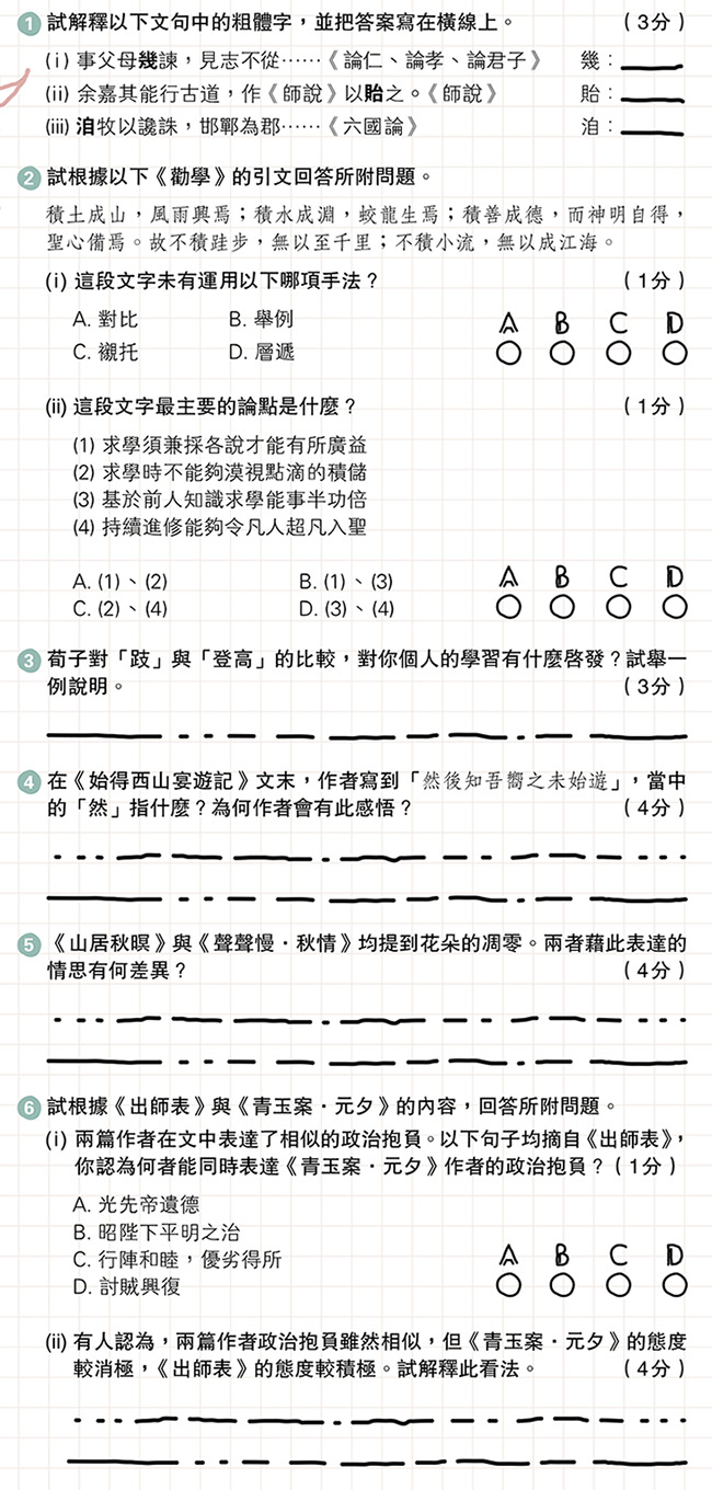 教育 文憑試攻略.模擬試題:甲部:指定閱讀篇章(30%) 發佈於 8 個月 前 2025 年 2 月 11 日 By 明報 【明報專訊】(1) 試解釋以下文句中的粗體字,並把答案寫在橫線上。(3分) 相關文章: Up Next 大人ing:另類「榜樣」 不要錯過 公民點對點:內地報考研究生 人數連跌兩年 繼續閱讀 贊助商 猜你喜歡