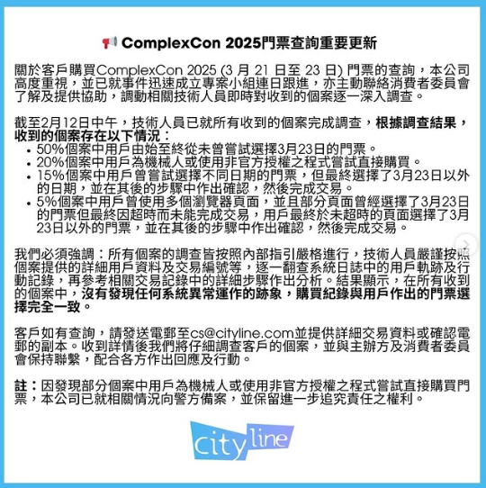 Cityline表示,收到客戶查詢後已成立專案小組跟進,並聯絡消委會了解。技術人員調查所有收到的個案後,發現5成個案從未選擇3月23日門票,2成個案是機械人或使用非官方授權的程式嘗試直接購買;15%個案曾選擇不同日期的門票,但最終選擇3月23日以外日期,並在稍後步驟確認,最終完成交易。5%個案曾使用多個瀏覽器頁面,部分選擇23日門票的頁面因超時無法完成交易,最終在未超時頁面選擇了其他日子門票,並完成交易。