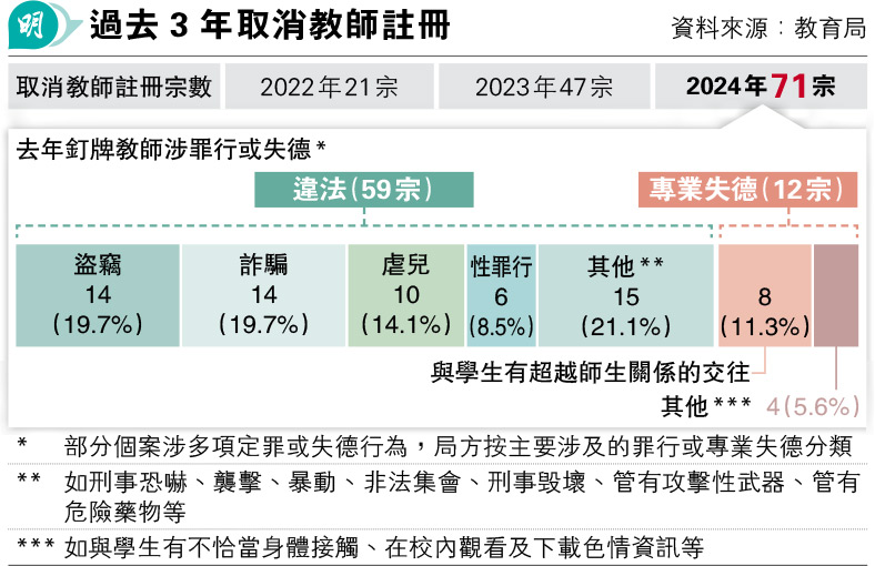教育局昨提交補充文件,顯示去年71宗被DQ的教師中,59宗涉違法罪行,包括15宗涉刑事恐嚇、暴動、非法集會等;性罪行6宗。另12宗專業失德,分別8宗「與學生有超越師生關係的交往」、4宗不恰當身體接觸或在校內觀看及下載等色情資訊等(見表)。