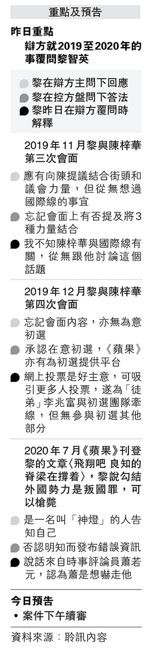 另一方面,控方早前指2020年7月5日,黎智英在《蘋果》專欄文章〈飛翔吧 良知的脊梁在撐着〉寫道:「有心人說,快點走,勾結外國勢力是叛國罪,可以是槍斃的啊!」並向黎指出「看來真理對你無關重要」。黎昨解釋,文中的「有心人」是人稱「神燈(燈神)」的前亞洲電視編劇,對方曾在其節目着自己離港,強調僅在文中引述該人說法。黎其後補充該「有心人」為蕭若元。