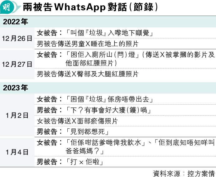 案情指出,2019年,18歲的女被告與前男友誕下X,約6個月後將X交給寄養家庭照顧。她後來與男被告同居並生下一名女兒。2022年12月24日至2023年1月5日,女被告從寄養家庭接X回家度假。綜合兩名被告的WhatsApp通訊紀錄及警誡供辭,他們在家逼X睡在地上或馬桶上,不斷辱罵他「垃圾」,形容他「樣衰」及「嘔心」。