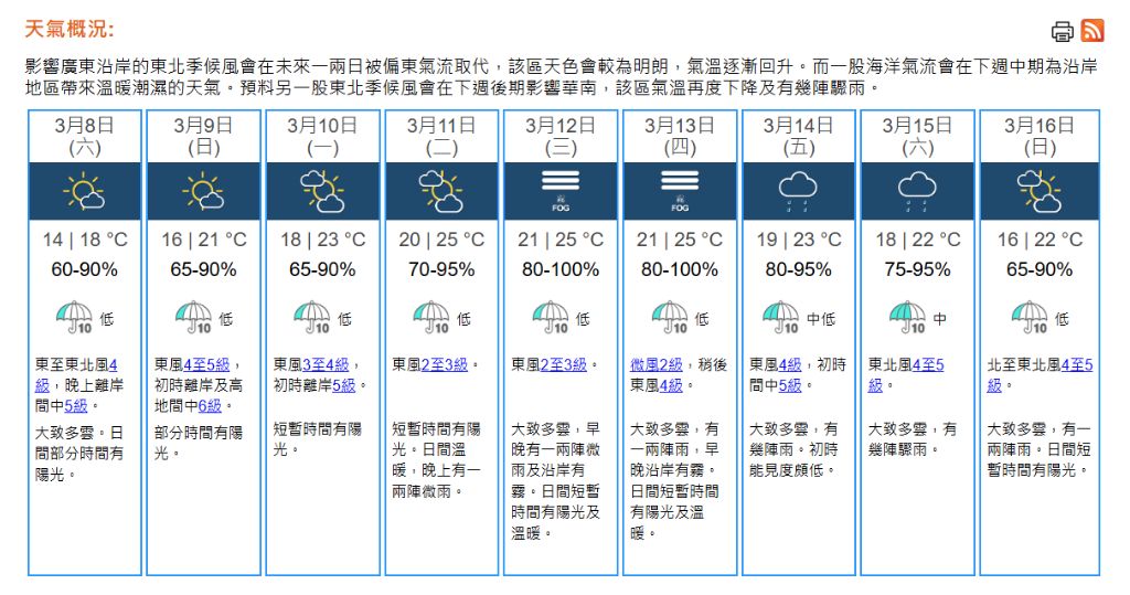 即時熱點 天氣|天文台:多雲有陽光 最高18°C (10:21) 發佈於 7 個月 前 2025 年 3 月 8 日 By 明報 上午10時,天文台錄得氣溫15.9°C,相對濕度69%。本港地區今日(8日)大致多雲,日間部分時間有陽光,最高氣溫約18°C,最低氣溫約14°C。吹和緩東至東北風,晚上離岸風勢間中清勁。展望未來一兩日氣溫逐漸回升,天色較為明朗。下周中期漸轉溫暖潮濕,沿岸有霧。(天文台) 相關文章:天文台天氣天氣速遞編輯推介 Up Next 健力士世界紀錄:最年長女性髮型師 108歲日本婆婆最擅長剪「飛機頭」 (15:27) 不要錯過 天氣|天文台:周六多雲早上有微雨 氣溫介乎13至18°C (21:01) 繼續閱讀 贊助商 猜你喜歡 天氣|酷熱警告生效 天文台:周末有一兩陣驟雨 (08:22) 天氣|天文台:周四天晴局部地區有驟雨 最高32°C (20:56) 今年10月已有4日達33℃以上 破1884年以來紀錄 (17:45) 天氣|天文台:天晴酷熱最高33°C 局部地區有驟雨 (08:14) 天氣|天文台:周三天晴酷熱 最高33°C (21:00) 水利部和中國氣象局發布山洪預警 (22:56)
