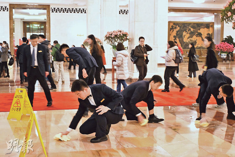 中國 花絮:疑有委員大堂倒瀉茶水 工作人員急抹地 發佈於 8 個月 前 2025 年 3 月 11 日 By 明報 【明報專訊】全國政協閉幕會昨天結束後,一樓大堂地面出現一攤液體,疑似有人不慎打翻水杯。此時正值會後清場,參會人員已經大部分步出室外,不過工作人員發現後迅速放置防滑提示板,並守在原地提醒路過者注意。四五個身穿西裝的年輕男性工作人員很快到場,手持抹布清理地面水漬;有工作人員彎腰俯身抹地,一名負責人見狀呼喊對方「蹲下去擦」,又指揮眾人擴大範圍將地板仔細抹乾。會議期間,大堂在多個角落設置服務點,用紙杯向在場人士提供茶水。 明報記者 (2025全國兩會) 相關文章: Up Next 人大閉幕 趙樂際呼吸道感染缺席 改副委員長李鴻忠主持 「兩高」報告支持率創新高 不要錯過 中旅研究院長戴斌 倡推散客友好型城市 繼續閱讀 贊助商 猜你喜歡