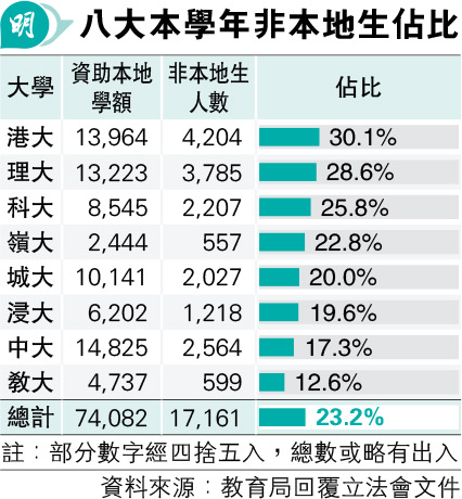 教育局周一(10日)向立法會「推動香港成為國際教育樞紐小組委員會」交代各院校收生情况,反映各校非本地本科生佔本地學額比例介乎12.6%至30.1%,八大今學年共取錄17,161名非本地本科生,整體佔本地學額23.2%。當中港大佔比為30.1%,該校在學非本地本科生共4204人。