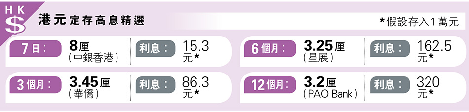 經濟 港元定存中銀7日年利率見8厘 發佈於 7 個月 前 2025 年 3 月 13 日 By 明報 【明報專訊】港元定存高息精選7日高見8厘,為中銀香港「特優港元定期存款(以外幣兌換)」優惠之年利率 (請看附圖) 相關文章: Up Next 九倉全年基礎盈利28億 遜預期 吳天海:葵涌建新物流中心 斥資最多60億 不要錯過 基金特區:美經濟衰退疑慮 保德信看好美債 料聯儲局今年減息半厘 利好債價 繼續閱讀 贊助商 猜你喜歡