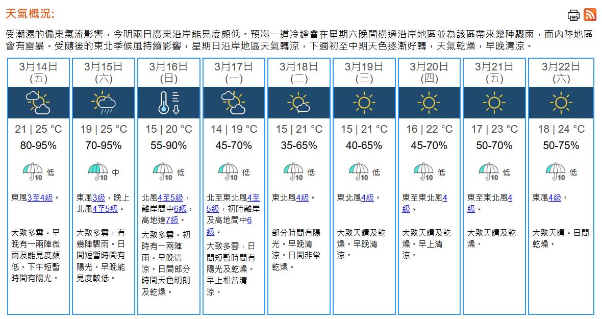 即時熱點 天氣|天文台:早晚有微雨、能見度頗低 最高25°C (08:45) 發佈於 7 個月 前 2025 年 3 月 14 日 By 明報 早上8時30分,天文台錄得氣溫21.2°C,相對濕度92%。 一股潮濕的偏東氣流正影響廣東沿岸。本港今早(14日)能見度頗低,港內的能見度曾降至3000米以下。此外,一道雲帶覆蓋沿岸地區及南海北部。 本港地區今日大致多雲。早晚有一兩陣微雨及能見度頗低。下午短暫時間有陽光,最高氣溫約25°C。吹和緩東風。 展望明日(15日)日間溫暖,晚上至周日(16日)北風增強,氣溫逐步下降。下周初早上最低氣溫在14°C左右,日間乾燥。(天文台) 相關文章:天文台天氣天氣速遞編輯推介 Up Next 天文台取消黃色暴雨警告信號 (16:36) 不要錯過 米芝蓮2025|30歲前奪年輕主廚大奬感滿足 Ankôma主廚王歲允:小炒王成創作靈感【短片】 (21:12) 繼續閱讀 贊助商 猜你喜歡 周末近天文大潮 強颱料入400公里 天文台考慮周五晚發出一號戒備信號 (12:07) 麥德姆|麥德姆周六進入本港800公里範圍 央視:料為華南地區帶來明顯風雨 (11:27) 天氣|酷熱警告生效 天文台:周四周五天晴酷熱 周六驟雨漸增 (08:14) 麥德姆|央視:料麥德姆為華南地區帶來明顯風雨 (13:40) 麥德姆 | 珠西海域漁船明晚全部回港避風 (21:56)
