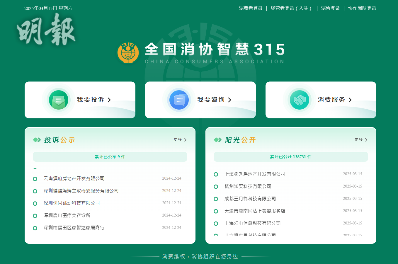 即時兩岸 全國消協智慧315平台上線 消費者登錄可投訴 (18:05) 發佈於 7 個月 前 2025 年 3 月 15 日 By 明報 由中國消費者協會聯合全國消協組織共同打造的「全國消協智慧315平台」昨日正式上線。 消費者可通過瀏覽網頁,或微信、支付寶App搜索「消協315」小程序註冊登錄平台。註冊登錄後,可進入「我要投訴」、「我要諮詢」模塊進行在線投訴和諮詢,使用消費維權服務。平台還設置「消協幫您查」、「消協幫您選」等模塊,為消費者提供企業服務聯繫方式、商品比較試驗結果等信息查詢。(新華社) 相關文章:投訴消協智慧315平台消費者權益編輯推介 Up Next 冰上扒龍舟在新疆高山開賽 港隊「酷啦啦」(多圖) (02:20) 不要錯過 央媒製「統一」圖 籲轉發支持 (01:25) 繼續閱讀 贊助商 猜你喜歡 歐消費者組織指控Shein 「暗黑模式」誘購浪費 銀行委收數代理處理帳戶 去年下半年急增25% 調查:社署社工兩成擬5年內離職 工會指管理有問題 署方:面談協助曾成功留人 舒適堡結業 政府專責組警商罪科介入 「曬背族」佔公園 裸露身體遭投訴 去年19宗涉廉署投訴 1言辭無禮指控屬實