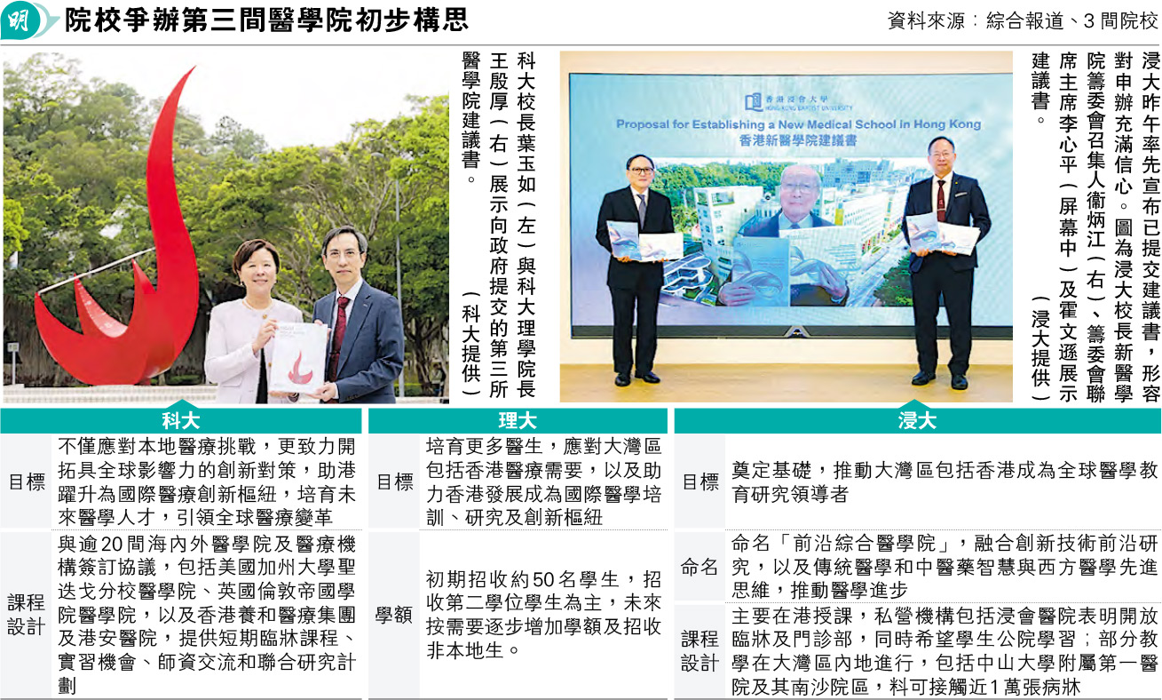 昨午率先宣布已提交建議書的浸大表示,充滿信心。校長及新醫學院籌備委員會召集人衞炳江稱,校方建議書提供極具競爭力的元素,符合工作組羅列的主要考慮條件。校方又計劃將新醫學院命名為「前沿綜合醫學院」,致力通過融合創新技術和前沿研究,在各種不同的醫學實踐之間架起橋樑。浸大籌委會聯席主席霍文遜和李心平表示,新醫學院將奠定基礎,推動香港和大灣區成為全球醫學教育和研究的領導者。