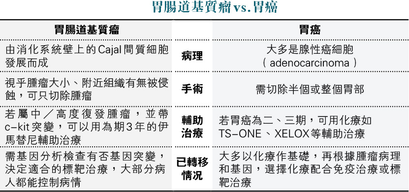 胃腸道基質瘤一般會以手術根治,手術後根據腫瘤復發風險,以評估是否需要輔助治療。有別於胃癌(詳見附表),胃腸道基質瘤的輔助治療並非化療,如復發風險屬中度至高度的腫瘤,可以考慮標靶治療伊馬替尼(imatinib),作為期3年的輔助治療。最近有研究對比服用伊馬替尼6年和3年的分別,前者大大改善無復發存活期,但對於總體生存率並沒有顯著差別。至於高復發的胃腸道基質瘤該用3年或6年藥物,則有待進一步研究數據確定。