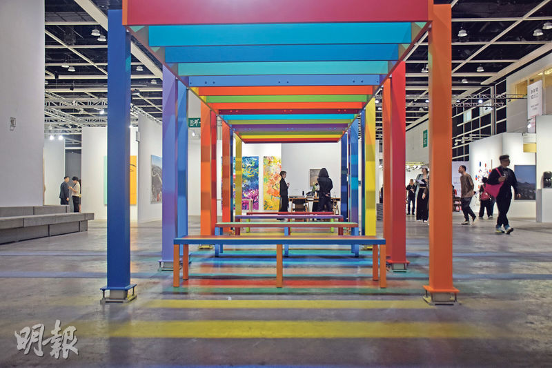 郭青介紹是次Art Basel中,「18件大型裝置藝術品肯定是一個大亮點」。匯集18件大型裝置的「藝聚空間」展區,是策展人Alexie Glass-Kantor以「歲月流轉」為主題,最後一次為該空間策展。圍繞「歲月流轉」的「歷程」、「轉化」、「交匯」、「根源」4個展區,分佈在兩層展廳的4條走廊中。踏入Art Basel一樓展廳,首先見到的便是英國藝術家Liam Gillick的作品Perpetual Discussion Platforms。彩虹色的柱、寬敞的座位,裝置彷彿寫住「歡迎入座」,路過的觀眾卻遲疑再遲疑,將展品介紹反覆瀏覽,沒有「禁止觸碰」,仍然不敢接觸——或許這正是藝術家的用意。在Liam Gillick看來,人們通過設計空間塑造行為,但他希望不限定空間用途,只邀請觀眾聚集,在色彩、光線與時間流動間,交流、停頓、分歧……一切皆可誕生。