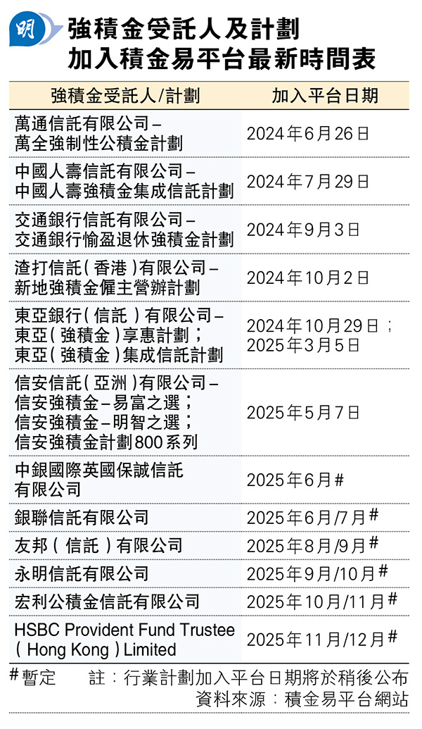 【明報專訊】「積金易」平台(eMPF)於去年6月啟動,推出至今近9個月,目前共有5個受託人經已加入eMPF,所有受託人預計今年第三季/第四季加入eMPF(見表),日後全港僱主和打工仔都可以「更易」和「更平」處理強積金(MPF)。早前有部分MPF計劃成員,擔心自己或會在新制度實施前被提早解僱,有MPF供應商提醒,強積金成員切勿輕信坊間對eMPF的誤解,並點出成員對「積金易」平台的六大常見迷思,值得每個MPF成員留意。